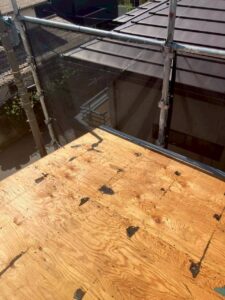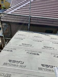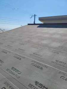シートの上に、ルーフィング(屋根材の下に敷く防水シート)を設置します。