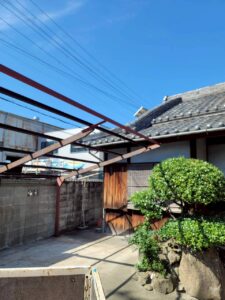 大阪府岸和田市にお住いのお客様より、「台風の影響でポリカ(ポリカーボネート)屋根の端が捲れてしまった。だんだん捲れた部分が広がり、雨水が吹き込んできたので張り替えたい」とのご依頼をいただきました。