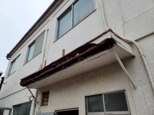 庇の上のモルタルは脆くなって崩れ始めており、このままでは落下する可能性があります。