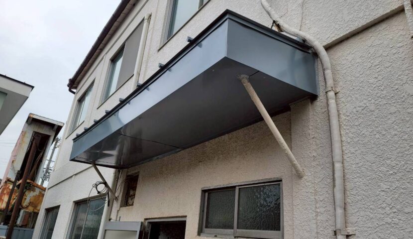 庇全体をコンクリートパネルで覆い、その上から板金を被せて補強しました。
