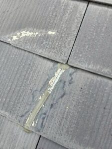 スレート屋根の割れ目に雨漏りの痕が見られます。
