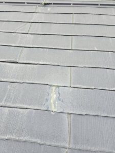 スレート屋根の割れ目に雨漏りの痕が見られます。